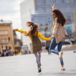 young red-haired mom and her wonderful red-haired daughter have fun outdoors dressed in dresses